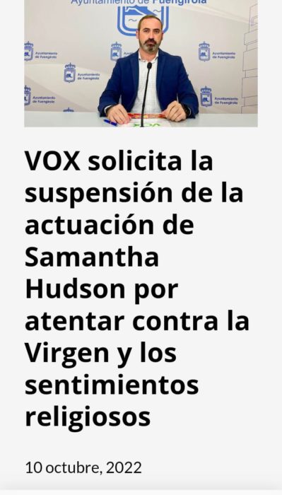 La falta de coherencia en Vox Málaga solo es equiparable a la falta de preparación de sus cargos y cargas orgánicos y orgánicas. Ayer, un indignadísimo Antonio Luna, concejal de Vox en el Ayuntamiento de Fuengirola, mano derecha de Ortega Smith y del último caído en desgracia, Tomás Fernández, solicitó al ayuntamiento de Fuengirola la suspensión de la participación de la cantante Samantha Hudson en la Feria de Nuestra Señora del Rosario, por “atentar contra la Virgen y los sentimientos religiosos” en sus letras.