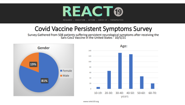 Basó esta declaración en los resultados de una encuesta realizada por React19 ( pdf ), un sitio web que brinda consejos sobre lesiones por vacunas y tratamiento temprano. Hubo 508 pacientes que sufrieron lesiones posteriores a la vacunación evaluados en octubre de 2021 como parte del cuestionario.
