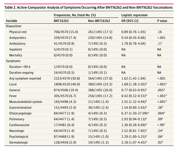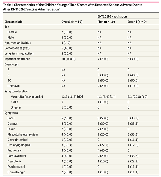 El estudio publicado en la revista de American Medical Association, JAMA, incluyó a 7.806 niños de cinco años o menos que fueron seguidos durante un promedio de 91,4 días después de su primera vacunación con Pfizer. Fue un estudio de cohorte retrospectivo realizado como una encuesta en línea autenticada (tasa de respuesta del 41,1 %) en la primavera de 2022 que incluyó a padres o cuidadores que registraron a niños para la vacunación contra el SARS-CoV-2 en centros de atención ambulatoria en Alemania. Comparó los eventos adversos con los de los mismos niños con otras vacunas para controlar la sobrenotificación.