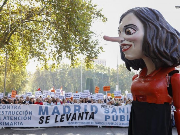 Antes del comienzo de la protesta, en distintos puntos del recorrido, los participantes han comenzado a corear lemas en favor de la “sanidad pública” y, en la zona del Paseo del Prado, han exhibido una gran figura caricaturizada de la presidenta madrileña.