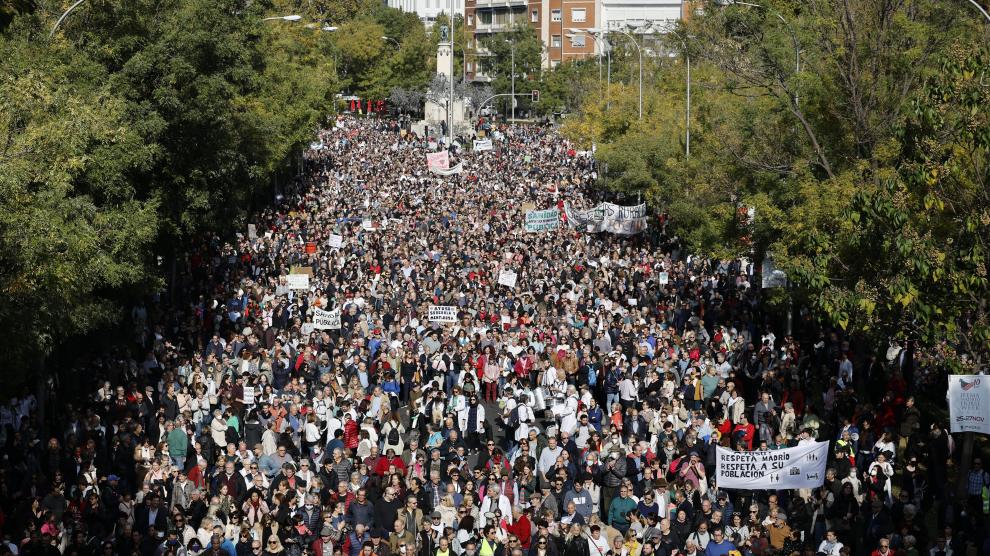 Se trata de una marcha multitudinaria -convocada inicialmente por la Federación Regional de Asociaciones Vecinales de Madrid (FRAVM) y a la que se han sumado sindicatos y partidos políticos- bajo el lema ‘Madrid se levanta por la Sanidad Pública’ y que se dirige en cuatro columnas con puntos de origen en diferentes zonas de la ciudad hasta confluir en la plaza de Cibeles.