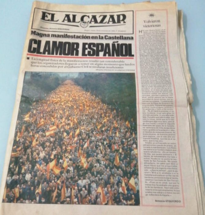 En los años 1985 y 1986 sólo El Alcázar fue capaz de convocar el 20N a más de un millón de personas en La Castellana de Madrid (ahí están las fotos). También yo estuve allí, por cierto con algunos de los que hoy están en VOX. En aquellos años España no estaba, ni de lejos, en la situación en la que hoy se encuentra y aún así, sólo un periódico en trance de desaparecer (murió en 1987) fue capaz de convocar a un millón de españoles dos años seguidos. Hoy, VOX, con muchos más MMCC a su servicio, y viceversa, empezando por El Toro de Wall Street TV y siguiendo por el todopoderoso gurú de la derecha, Jiménez Losantos, y con unas condiciones de degradación y decadencia política dignas de un nuevo Dos de Mayo, no ha sido capaz de congregar a más de ocho mil españoles en La Plaza de Colón.