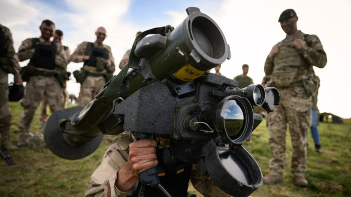 Un miliar ucraniano con un lanzamisiles antitanque Javelin durante un entrenamiento con las Fuerzas Armadas británicas, el sur de Inglaterra, el Reino Unido, el 11 de octubre de 2022