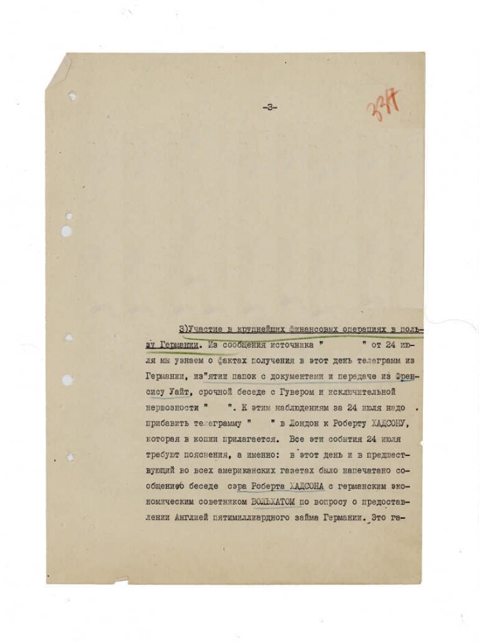 El documento interno del servicio de inteligencia soviético, fechado el 24 de julio de ese año, fue subido recientemente a los archivos en línea de la Biblioteca Presidencial B. N. Yeltsin. Allí, se registran los intentos de ocultar los hechos en ambos países. En particular, se señala al expresidente estadounidense Herbert Hoover (1929-1933) como alguien “directamente involucrado e interesado” en los preparativos del préstamo y que podría “ejercer un considerable apoyo a las negociaciones con los alemanes” que llevó a cabo otro protagonista, el secretario del Comercio Exterior británico, Robert Hudson.