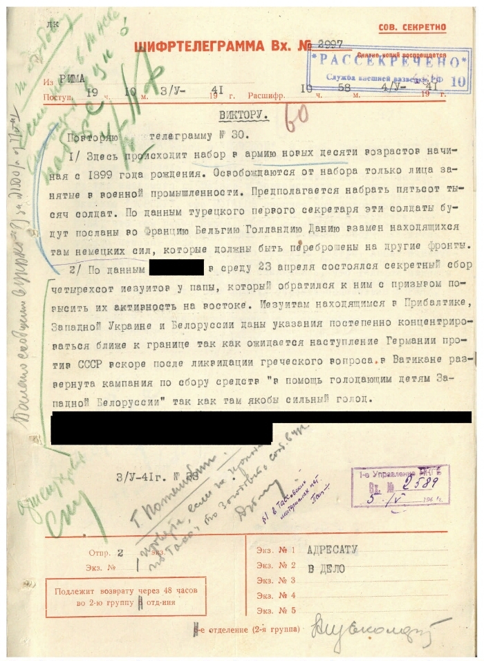 Otro documento desclasificado también menciona a Bielorrusia, pero como un área de interés especial para el Vaticano. Este informe revela que el papa Pío XII estaba al tanto de los planes de Hitler para invadir la URSS con al menos dos meses de antelación. El 23 de abril de 1941 el pontífice convocó a unos 400 jesuitas para instarlos a aumentar sus actividades en las repúblicas bálticas, al oeste de Ucrania y de Bielorrusia. Deberían “concentrarse más cerca de la frontera” bajo el pretexto de ayuda a la población contra el hambre.