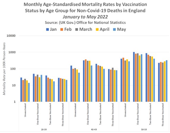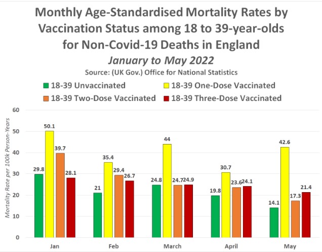 En todos los meses desde principios de 2022, los jóvenes de 18 a 39 años parcialmente vacunados y doblemente vacunados han tenido más probabilidades de morir que los jóvenes de 18 a 39 años no vacunados. Sin embargo, los jóvenes de 18 a 39 años vacunados tres veces han tenido una tasa de mortalidad que ha empeorado cada mes tras la campaña masiva de refuerzo que tuvo lugar en el Reino Unido en diciembre de 2021.