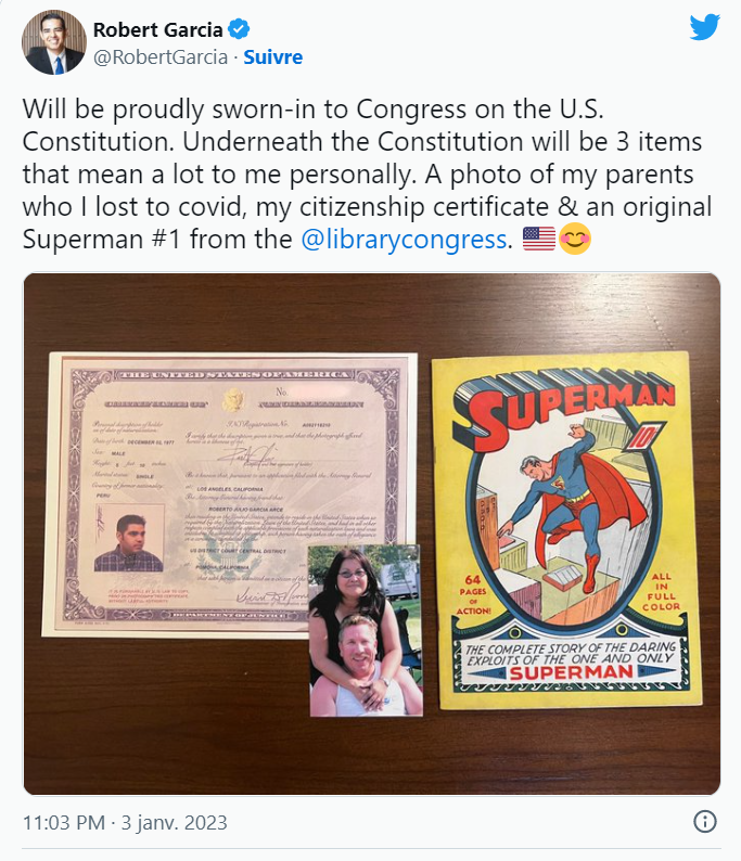El pasado 3 de enero de 2023, día de apertura del 118º Congreso de los EEUU, los nuevos miembros debían jurar su cargo. Algunos posaron su mano sobre la Biblia y la Constitución de los Estados Unidos. Robert García, por su parte, prefirió desmarcarse, sin que al parecer eso contravenga el reglamento de la institución, y prestó juramento sobre una rarísima edición del cómic Superman del año 1939 (que pertenece a la biblioteca del Congreso), su certificado de nacionalidad y una foto de sus padres fallecidos.