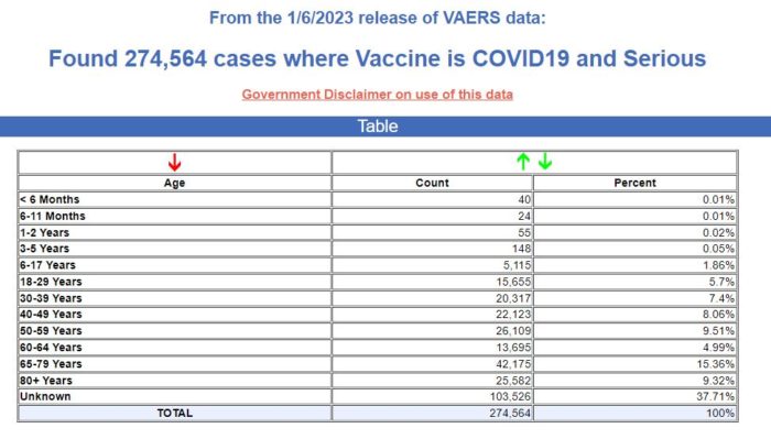 Aunque las vacunas han sido promocionadas como «eficaces y seguras» y han sido aprobadas de emergencia, según la base de datos del Sistema de Notificación de Efectos Adversos de las Vacunas (VAERS), gestionada por los CDC y la FDA, que actúa como un «sistema nacional de alerta temprana para detectar posibles problemas de seguridad» de las vacunas estadounidenses, se han notificado 274.564 casos de efectos adversos graves tras la vacunación con COVID-19, según los informes realizados hasta el 6 de enero de 2023.