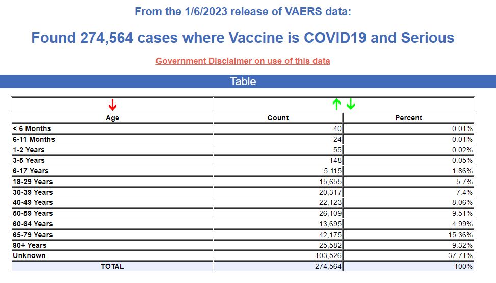 Aunque las vacunas han sido promocionadas como «eficaces y seguras» y han sido aprobadas de emergencia, según la base de datos del Sistema de Notificación de Efectos Adversos de las Vacunas (VAERS), gestionada por los CDC y la FDA, que actúa como un «sistema nacional de alerta temprana para detectar posibles problemas de seguridad» de las vacunas estadounidenses, se han notificado 274.564 casos de efectos adversos graves tras la vacunación con COVID-19, según los informes realizados hasta el 6 de enero de 2023.