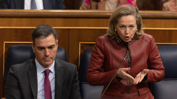 El presidente del Gobierno de España, Pedro Sánchez, y la ministra de Economía, Nadia Calviño, en una sesión del Congreso, Madrid, el 30 de noviembre de 2022.