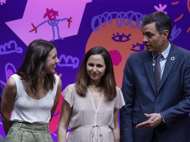 El presidente del Gobierno, con las ministras de Podemos Irene Montero y Ione Belarra, en un acto sobre derechos de la infancia, celebrado el pasado mes de julio.