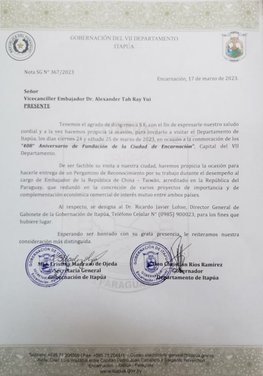 Es por ello que en virtud de las intensas y fecundas relaciones entre la República del Paraguay y la República de China (Taiwan). El Gobernador de Itapúa Christian Alejandro Ramírez y el concejal Departamental acuden a la Embajada de China-Taiwán junto al Embajador José Chih-Cheng.