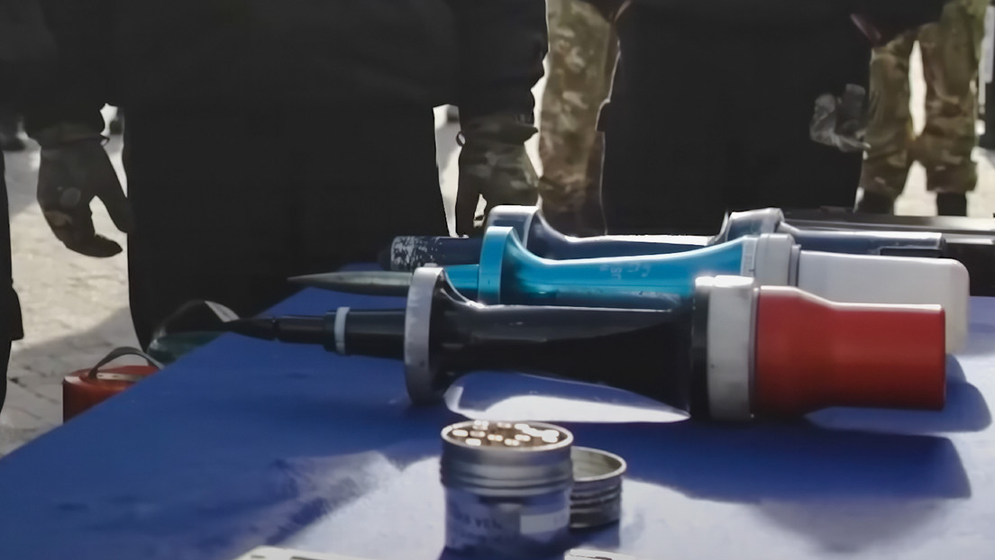 En la grabación se ve a varios oficiales del Ejército británico y al menos un oficial de EE.UU., así como varias municiones, una de las cuales, de color naranja y negro, ha atraído la atención de los especialistas.