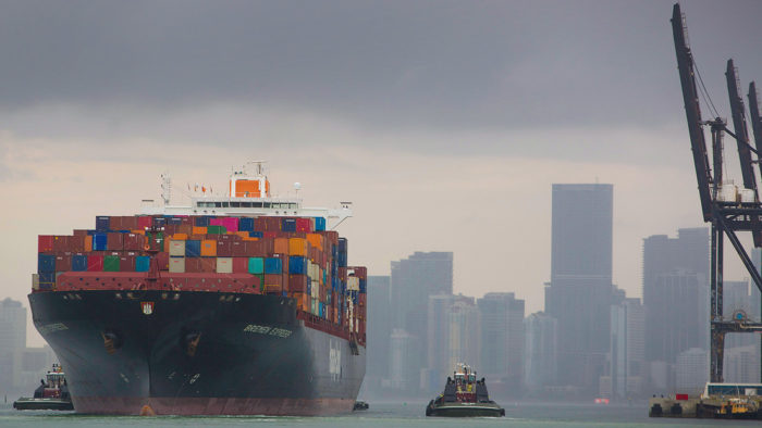 Un buque de carga se prepara para atracar en un puerto de Miami (Florida, EE.UU.), el 10 de junio de 2019.