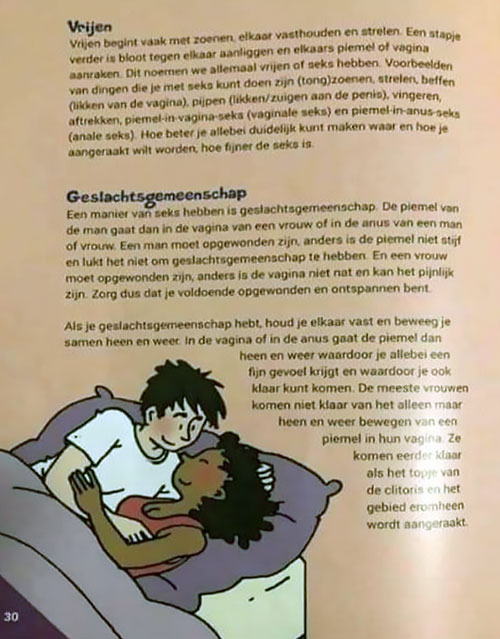 Uno de los libros infantiles recomendados por Rutgers para su uso en las escuelas primarias se llama “¿Qué es el sexo?” por Channah Zwiep. Aquí hay una página de este libro, con un extracto a continuación: