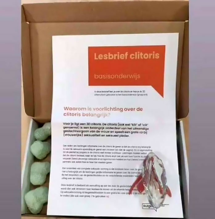 Parte del programa escolar de Rutgers / OMS / ONU “Spring Fever” está entregando clítoris en 3D a las niñas para alentarlas a comenzar a masturbarse. Por supuesto, defienden esto con afirmaciones de lo importante que es para las niñas conocer su propio cuerpo.