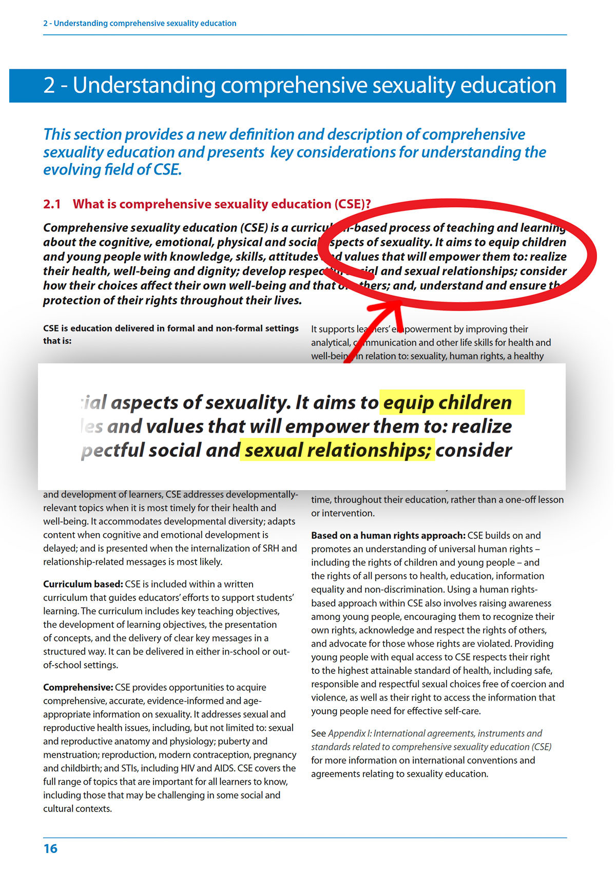 Las Naciones Unidas publicaron el documento “International Technical Guidance on Sexual Education”. Es la guía oficial para las escuelas primarias de todo el mundo. El objetivo de este documento se describe en la página 16: