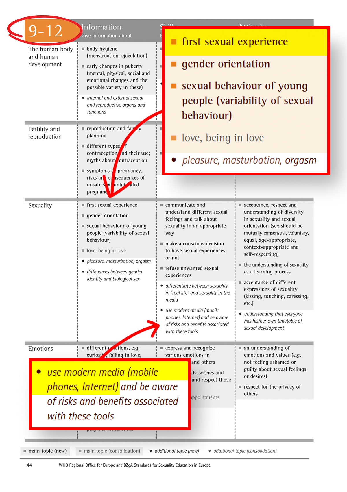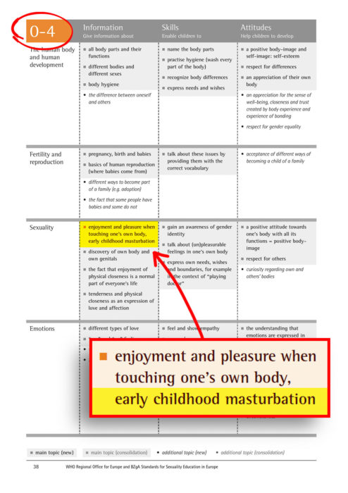 La Organización Mundial de la Salud está desarrollando aún más el programa para garantizar que los niños pequeños tengan parejas sexuales. Su documento “Standards for Sexuality Education in Europe” contiene las siguientes instrucciones para jardines de infancia y escuelas primarias: