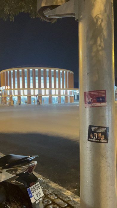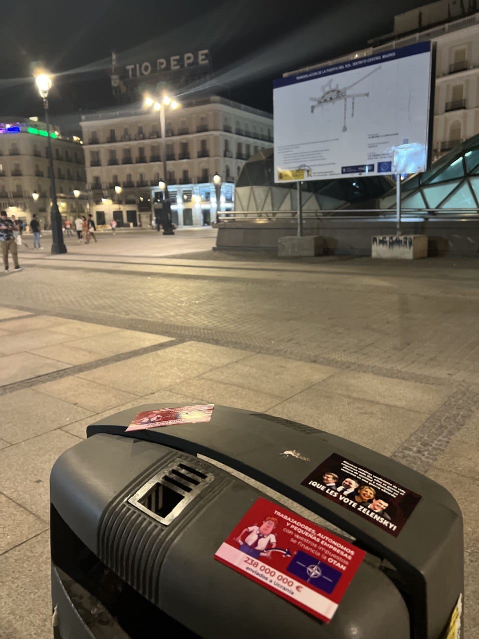 ¡Que les vote Zelenski! Inundan el centro de Madrid con pegatinas contra la financiación de la guerra de la OTAN en Ucrania