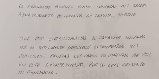 Escrito de renuncia a su cargo de concejal en Loranca de Tajuña presentado por Fernando Arance Viana