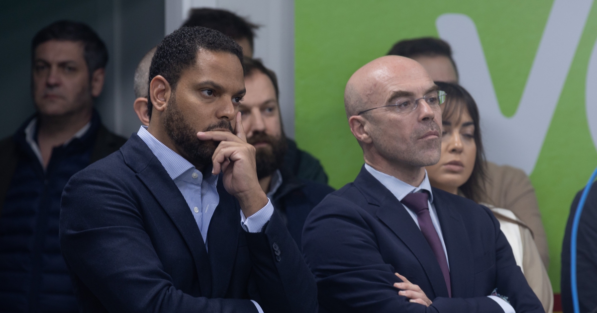 El secretario general de Vox, Ignacio Garriga (i) y el secretario general de Vox, Ignacio Garriga y el portavoz de Vox, Jorge Buxadé (d), escuchan una rueda de prensa del líder de Vox, en la sede nacional de Vox.