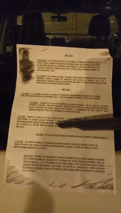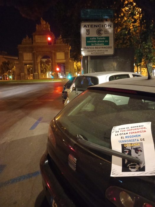 El pasado 20 de agosto, en el aniversario del asesinato de la periodista politóloga Daria Dugina, un grupo de activistas españoles distribuyó más de 4.000 folletos informativos bajo los limpiaparabrisas de los coches aparcados en el centro de Madrid.