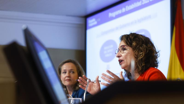 La ministra de Hacienda y Función Pública, María Jesús Montero, y la vicepresidenta primera y ministra de Asuntos Económicos, Nadia Calviño, durante la presentación del escenario macroeconómico 2022-2025 en abril