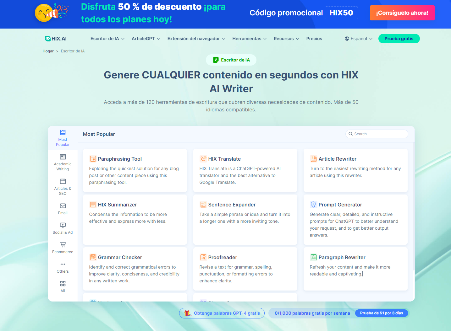 No es raro que la mayoría de los escritores de contenido se encuentren luchando contra el bloqueo del escritor o incluso simplemente cansados de tener que hacer un millón de correcciones gramaticales y de vocabulario diferentes al escribir. En tales casos, el uso de una herramienta como HIX AI Escritor puede permitirle acceder instantáneamente a más de 120 herramientas que pueden ayudarle a racionalizar varias tareas de redacción de contenidos para mejorar la productividad.