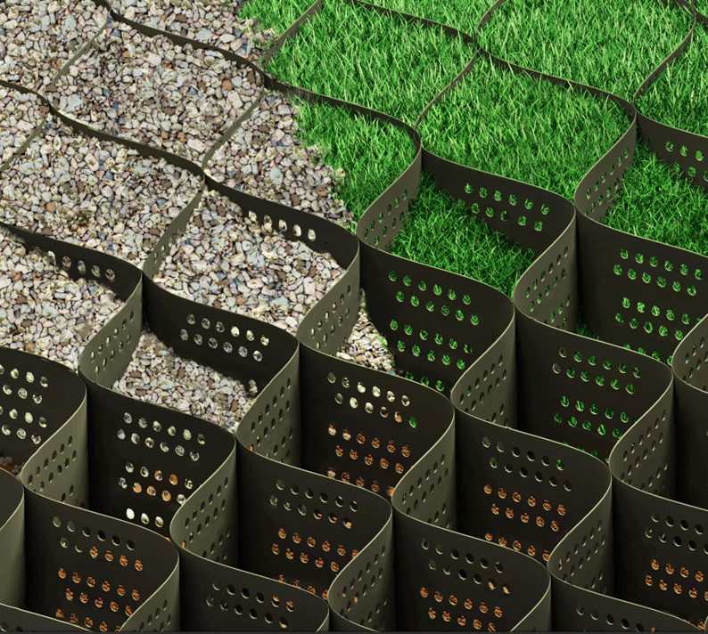 En paisajismo y construcción de carreteras, las geomallas tridimensionales se utilizan para reforzar el suelo y crear una base sólida para diversos firmes, así como para reforzar caminos de jardines, céspedes, terrazas, aparcamientos ecológicos, campos deportivos, taludes e incluso autopistas. La instalación de geomallas ayuda a proteger la superficie de la carretera de deformaciones bajo carga, evitar la formación de surcos y baches, y prevenir desprendimientos y la erosión del suelo.