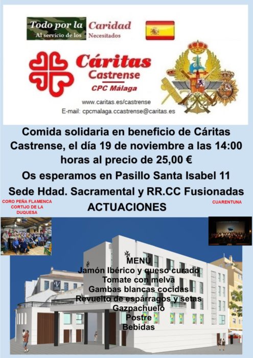(Remitido) Cáritas Castrense Málaga organiza un almuerzo solidario en favor de sus beneficiarios el próximo domingo día 19 a las 14 hora, en la sede de la Hermandad Sacramental Y RR.CC. Fusionadas .(PASILLO SANTA ISABEL,11) con un exquisito suculento menú preparado por el prestigioso cocinero Miguel Ángel Hurtado de la empresa “Málaga Soho Eventos y Extras” y servido por el personal del afamado Bar Atenas. Las actuaciones correrán a cargo de la “AGRUPACION MUSICAL CORTIJO LA DUQUESA” Y LA “CUARENTUNA DE MARBELLA”.