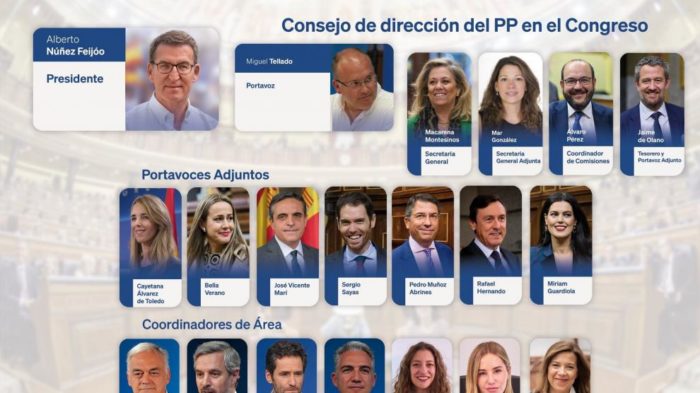 Así, el nuevo portavoz parlamentario del PP en el Congreso, el gallego Miguel Tellado, contará con la diputada alicantina como secretaria general del Grupo Popular. Además, la diputada por Zaragoza Mar González Bella será la secretaria general adjunta, el diputado por Coruña Álvaro Pérez será coordinador de comisiones; y el lucense Jaime de Olano será tesorero y portavoz adjunto.