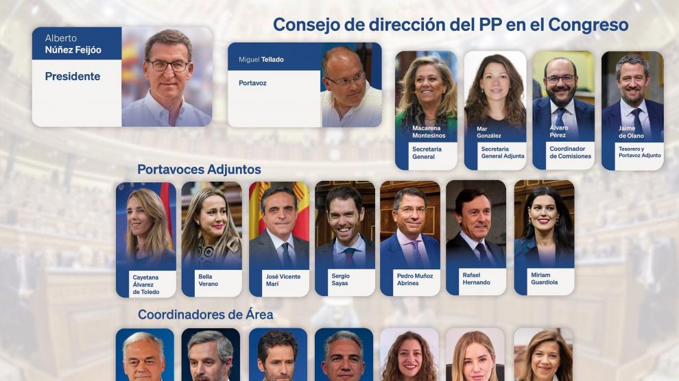 Además, formarán parte del consejo de dirección del Grupo Popular en el Congreso como portavoces adjuntos los diputados Cayetana Álvarez de Toledo (Madrid), Bella Verano (Huelva) José Vicente Marí (Baleares), Sergio Sayas (Navarra), Pedro Muñoz Abrines (Madrid), Rafael Hernando (Almería) y Miriam Guardiola (Murcia).