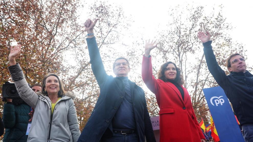 La secretaria general del PP, Cuca Gamarra, el presidente del Partido Popular, Alberto Núñez Feijóo, la presidenta de la Comunidad de Madrid, Isabel Díaz Ayuso, y el alcalde de Madrid, José Luis Martínez-Almeida, durante un acto del PP contra la amnistía, en el Templo de Debod,