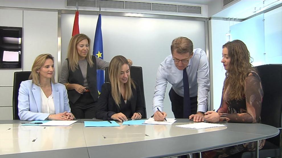 Las cuatro nuevas vicesecretarias del PP: Paloma Martín, Ester Muñoz, Ana Alós y Noelia Núñez, con Feijóo.