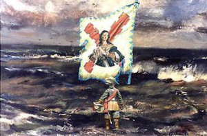 A los gritos de júbilo de este soldado acuden sus compañeros, y, colocando la imagen de Maria Inmaculada sobre la bandera española, caen todos de rodillas y cantan la. Salve.