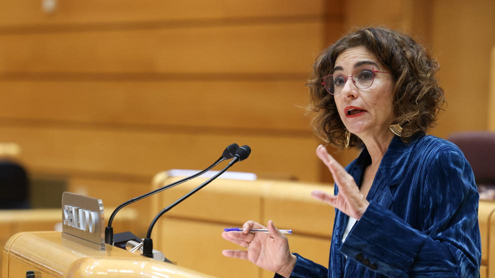 La vicepresidenta primera y ministra de Hacienda, María Jesús Montero, interviene durante una sesión plenaria en el Senado