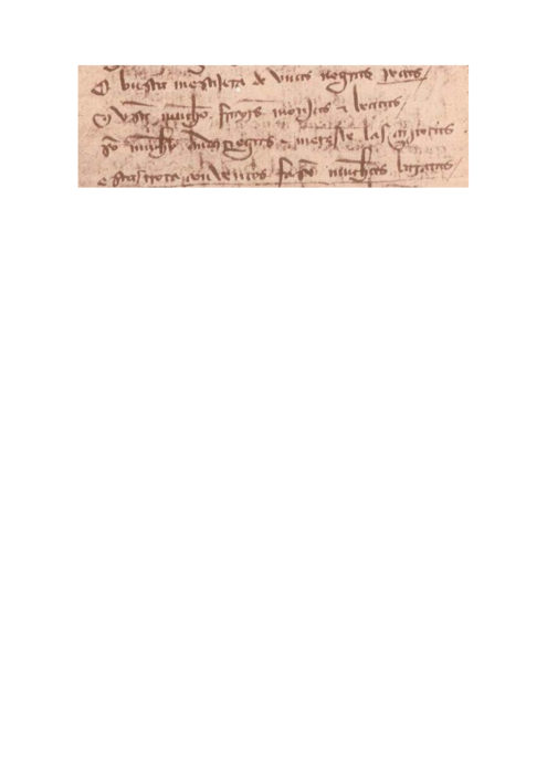Nos encontramos por tanto en la tesitura de encontrar una lectura alternativa para esta palabra que hasta ahora ningún editor había discutido. Debemos encontrar un adjetivo coherente con el sustantivo al que califica y que encaje en la idea fundamental que se quiere expresar en la estrofa, deducida del verso tercero: las mensajeras son muy andariegas, por lo que deben tener la planta del pie muy fuerte, debido a su costumbre y necesidad de realizar largas caminatas. Con esta premisa, y examinando con detenimiento el manuscrito, resulta muy sencillo encontrar una alternativa a la palabra “negras”: La letra “n” inicial es la conjunción de dos erres (la “r” al principio de una palabra se escribía doble); lo que parece una “g” es en realidad una “c” con cedilla, y la letra que sigue a esta “ç “ no es una erre sino una i latina. “Negras” es en realidad, actualizando la grafía, “recias”. En consecuencia, la reconstrucción del arquetipo sería: