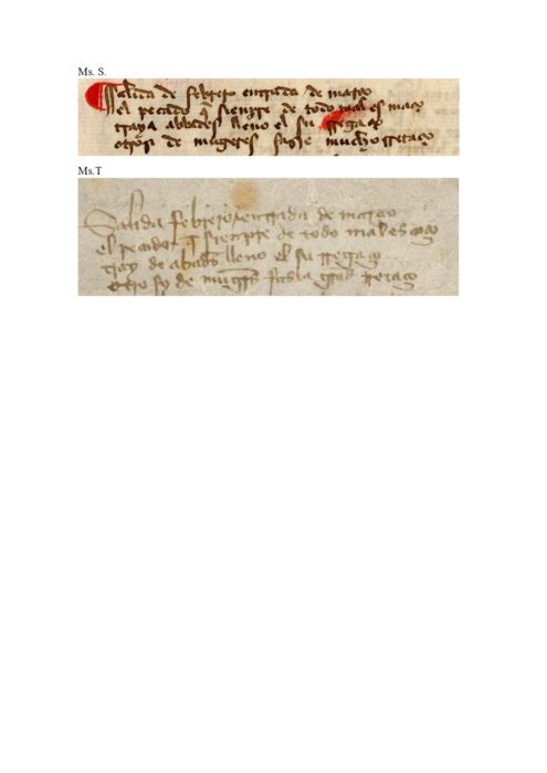 Resumiré las lecturas de los dos únicos manuscritos que la recogen (S y T) en un solo texto insertando entre corchetes las palabras cuya lectura pongo en entredicho. Todos los editores han aceptado las lecturas literales de las palabras que rematan los versos tercero y cuarto, y solo han puesto en duda la del que cierra el segundo, ya que difiere en ambos manuscritos: