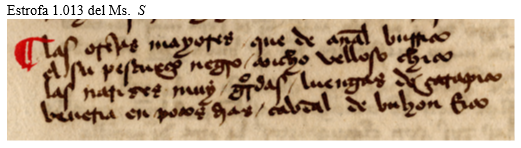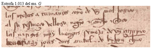 2ª) En el segundo verso, volvemos a ver en el ms. S un texto que parece elaborado artificialmente para corregir lo que parecerían errores técnicos de su correlativo del ms. G: la hipermetría de su primer hemistiquio y la hipometría de su segundo. En éste se dice: “el su pescueço velloso [8 sílabas] / negro, ancho, chico [6 sílabas]”. Pero parece mucho más fiel al original esta lectura, que describe primero el carácter velloso del cuello de la mujer y después menciona el color de ese vello, que la lectura del ms. S, que describe el cuello como si fuera negro de por sí; después añade que es ancho, y luego, como si fuera otra cualidad independiente de la primera, indica que es velloso. Por ello, entiendo que el copista del Ms G únicamente cometería el error (si es que no lo cometió el autor de su subarquetipo) de modificar ligeramente la redacción del verso sin alterar su estructura. Tal podría ser, pues, el arquetipo del segundo verso: “su pescueço velloso, negro, ancho e chico.