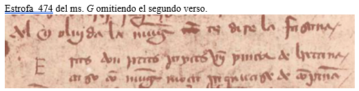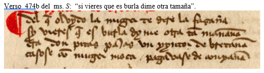 1ª) En el primer verso este manuscrito recoge dos hemistiquios hipermétricos, de ocho versos cada uno, lo que sería una incorrección impropia del poeta, pues el mensaje que contiene puede redactarse muy fácilmente dentro de los cánones de la cuaderna vía. Sin embargo, puede advertirse que el copista ha tratado de reproducir fielmente el texto que leía, que en vez de recoger la palabra “mayores” incluía otra que él no entendía, “tamañas” (tan grandes), lo que le llevó a transcribirla precedida de la preposición “a” convirtiendo lo que era un adjetivo comparativo en una inexistente locución adverbial causante de la referida hipermetría. Tan cierta era la ignorancia de este copista acerca de ese término, y tan sincero su deseo de transcribir el texto que leía sin falsificarlo, que en la estrofa 474, en cuyo segundo verso aparece la palabra “tamaña”, según puede leerseen el ms. S(aunque transcrita: tãmañana) optó por omitir totalmente el verso en que se incluía, dejando bien visible su hueco en el citado manuscrito, como si tuviera la intención de rellenarlo más adelante, cuando lograra descifrar su significado. En cambio, el copista del ms. S (o el de su correspondiente subarquetipo)optó por obviar todo obstáculo cambiando esa palabra por otra más usual que además permitiera que su hemistiquio fuera heptasílabo. Al aceptar ahora como original la lectura que corregimos del ms. G, “las orejas tamañas”, debemos considerar que también se acerca más al original la lectura de su segundo hemistiquio, que comienza con la conjunción “como”, a diferencia de la del ms. S, que se ve forzado a emplear la conjunción “que”. Por lo tanto, si queremos corregir el segundo hemistiquio para evitar su hipermetría debemos considerar que el copista del ms. G solo añadió innecesariamente el determinante “un” al sintagma nominal “añal borrico”(borrico de un año). Y así ya tendríamos reconstruido, a mi juicio, el arquetipo del primer verso: “las orejas tamañas como de añal borrico”.