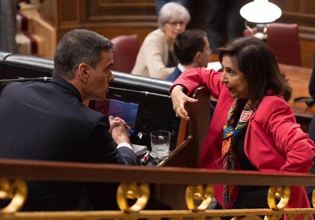 El presidente del Gobierno, Pedro Sánchez y la ministra de Defensa, Margarita Robles, durante una sesión plenaria, en el Congreso de los Diputados, a 10 de abril de 2024