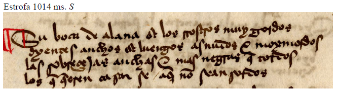 Por lo tanto, pudiera ser que este verso -ya alejandrino- expresara en su origen que la mujer cuando hablaba desplegaba unos labios muy largos y abultados: “su boca desalaba grandes rostros e gordos”. No obstante, esto es solo una hipótesis que dejo a la libre valoración del lector, por lo que aceptaré -con poco convencimiento- la lectura del ms. G en tanto no aparezca otro manuscrito que refuerce aquella.