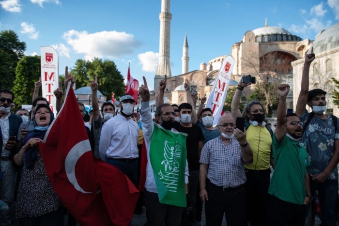 En la imagen: Islamistas celebran el decreto del presidente turco Recep Tayyip Erdogan, por el que la histórica catedral cristiana de Santa Sofía vuelve a convertirse en mezquita, en el exterior de Santa Sofía en Estambul, el 10 de julio de 2020. (Foto: Burak Kara/Getty Images)