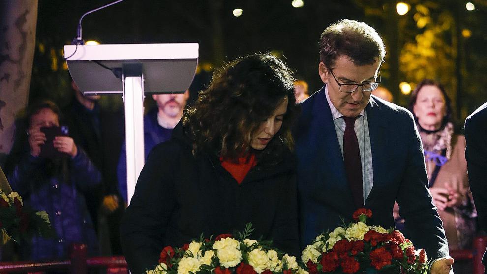 Isabel Díaz Ayuso y Alberto Núñez Feijóo participan en una ofrenda floral en homenaje a Gregorio Ordóñez