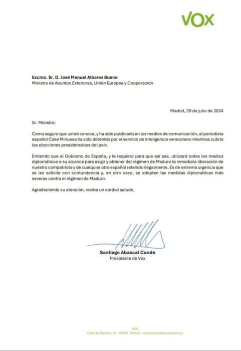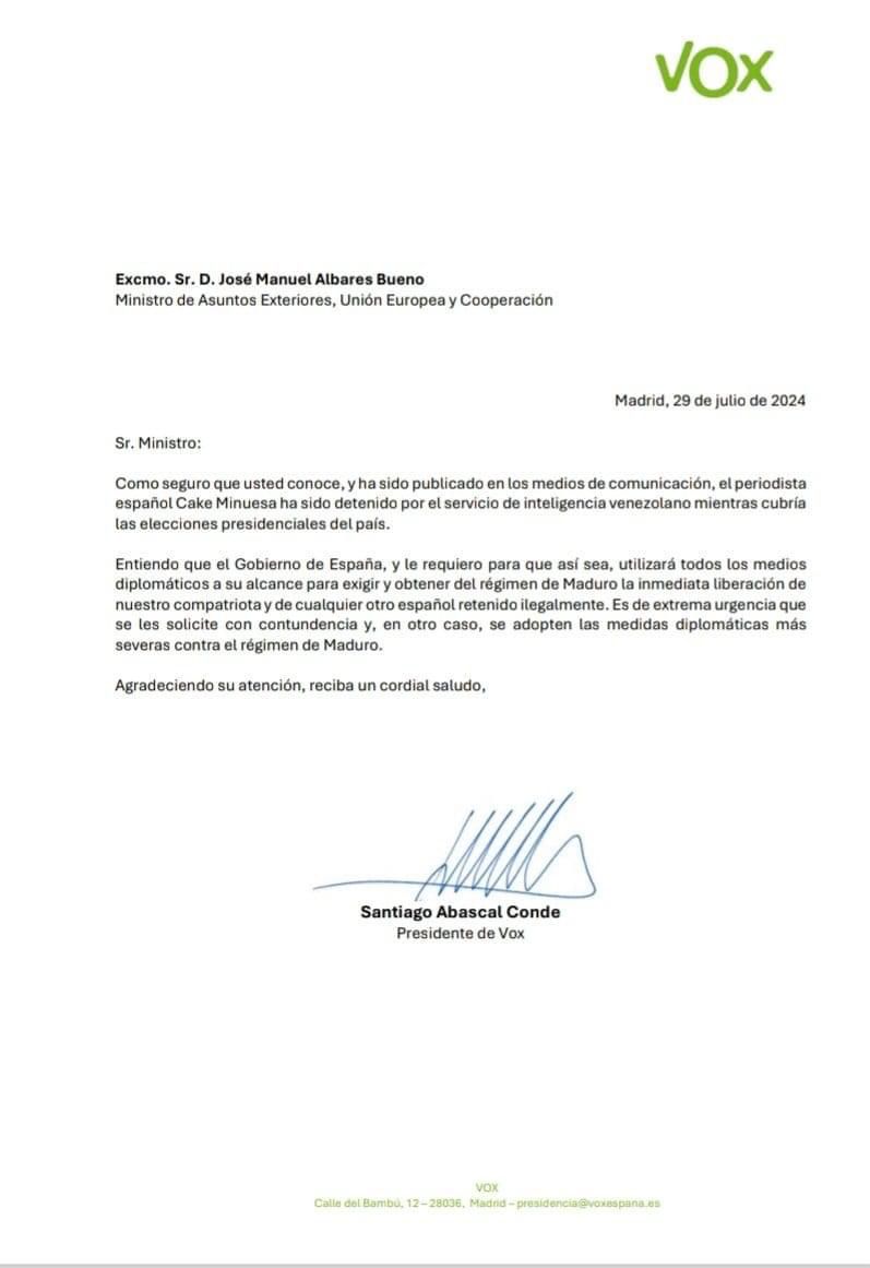 “Entiendo que el gobierno de España, y le requiero para que así sea, utilizará todos los medios diplomáticos a su alcance para exigir y obtener del régimen de Maduro la inmediata liberación de nuestro compatriota y de cualquier otro español retenido ilegalmente. Es de extrema urgencia que se les solicite con contundencia y, en otro caso, se adopten las medidas diplomáticas más severas contra el régimen de Maduro”, ha señalado en su misiva Santiago Abascal.