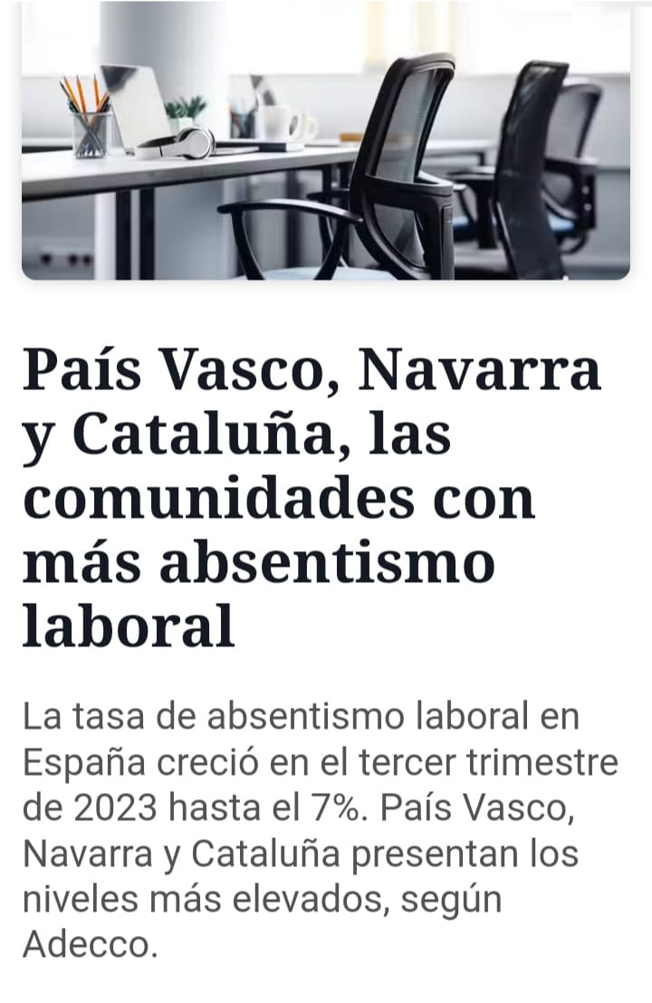 Más allá de la anécdota, el folclore y la mala leche que gastan algunos, las estadísticas del INE nos vienen a decir que las tres regiones con más absentismo laboral son Vascongadas, Navarra y Cataluña, con una tasa de absentismo del 7%.