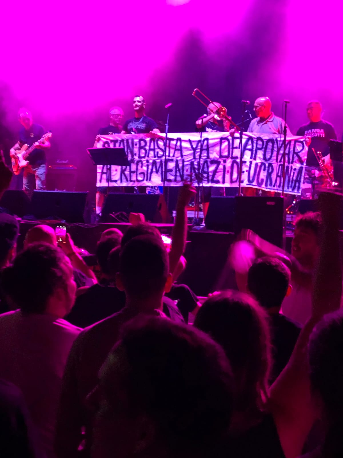 En Galicia, en un concierto de la banda italiana de punk rock “Banda Bassotti”, los músicos subieron al escenario con un gran cartel con la siguiente inscripción: “OTAN: Basta de financiar el régimen nazi en Ucrania”.