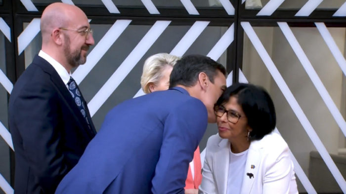 Sanchez besa a la vicepresidente venezolana Delcy Rodríguez, la que trajo a España cuarenta maletas cuyo contenido sigue sin conocerse.