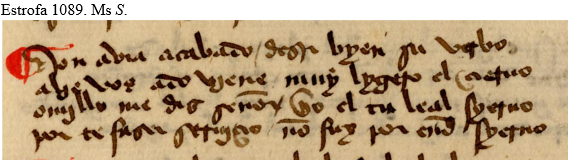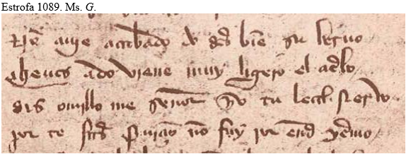 Hasta aquí hemos visto que los tres primeros versos de la estrofa cumplen a la perfección el requisito de la rima consonante que exige la técnica de la cuaderna vía, con las palabras verbo, ciervo y siervo. La particularidad viene en el verso cuarto, mal entendido hasta ahora por todos los editores, y cuya lectura es distinta en los dos manuscritos. En el ms. S parece leerse: «por te fazer serviçio / non fui por ende syervo» y en el G: «por te fazerserviçio/ non fui por ende yermo/yervo [?]».