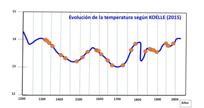 Es muy importante señalar que la mayor parte de esas 26 riadas se produjeron durante un período de frío generalizado conocido como la Pequeña Edad de Hielo. En la gráfica adjunta, la línea azul representa la evolución de la temperatura desde el año 1200 hasta la actualidad, mientras que los círculos rojos señalan el momento en que se produjeron dichas riadas Es destacable la continuidad con que aparecen estas catástrofes, tanto en los momentos en que la temperatura es ascendente como descendente, aunque hay una tendencia a que se concentren preferentemente en los periodos en que desciende la temperatura (18 versus 6).
